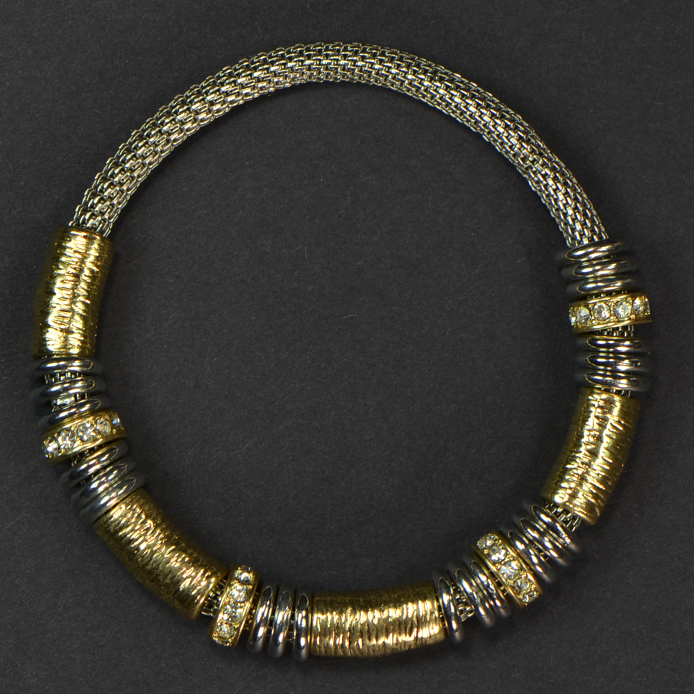 - Mixed Accents of Gold & Silver Roundelles & Cylinders on Silver Mesh