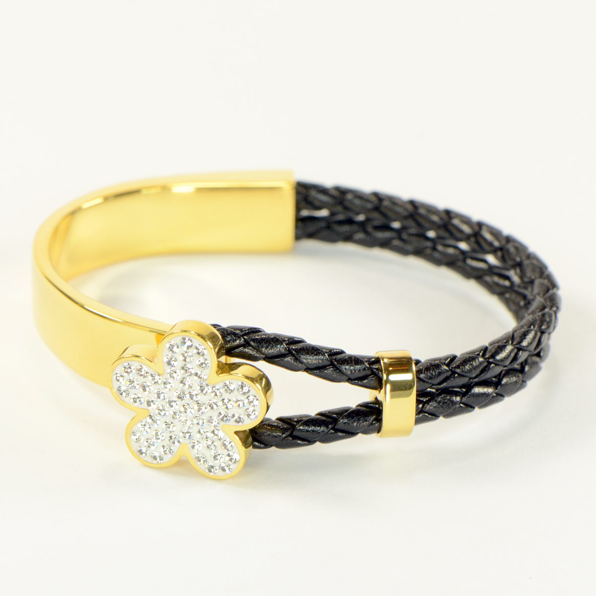 - Gold Tone Pave Flower & Black Leather Half Cuff
