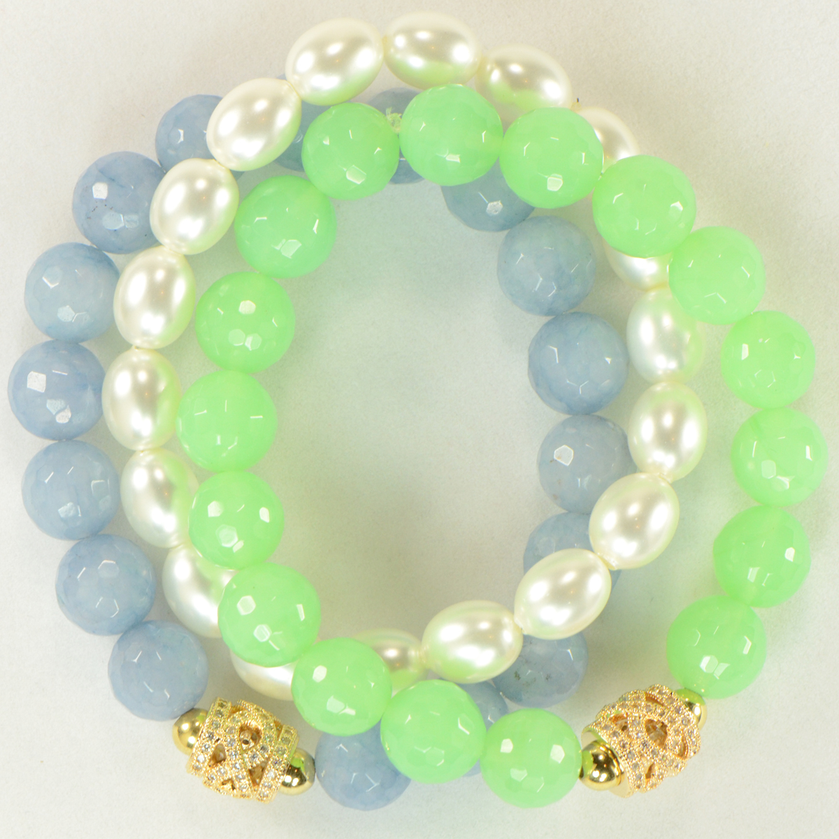 - Set of 3 Stretch Style Bracelet of Quartz & Pearl - 1 Pearl & 2 Quartz with Gold Accents