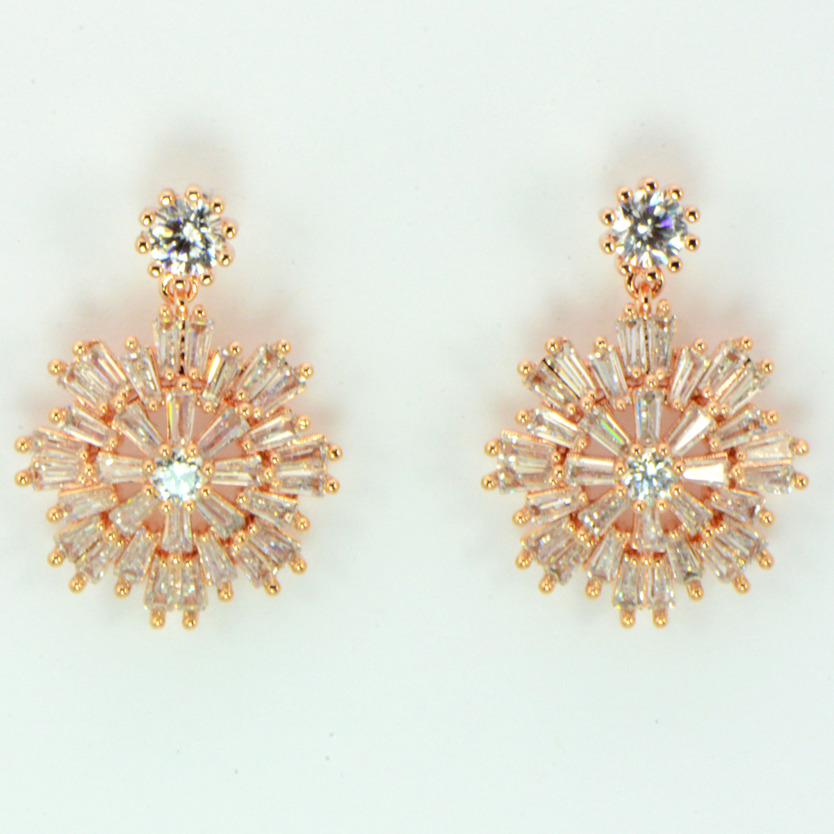 - High Quality Baguette Cut CZs in Snow Flake Design Drop in Rose Gold Finish Earrings