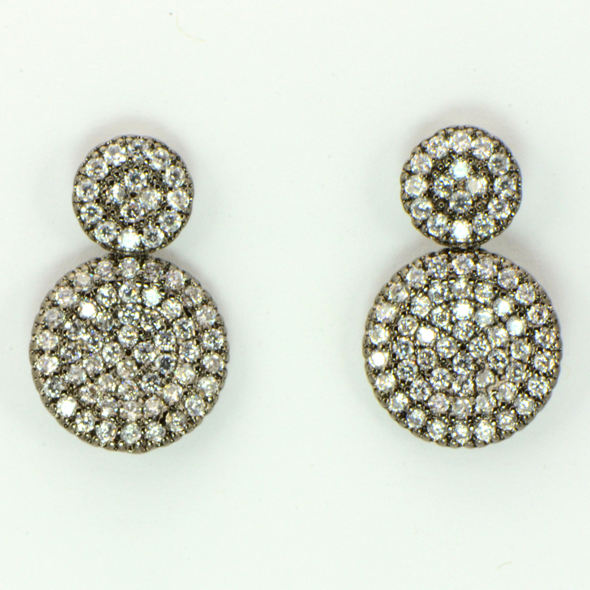 - Two Tier Round Disc Earrings with Handset Micropaved High Quality CZ Gunmetal Finish