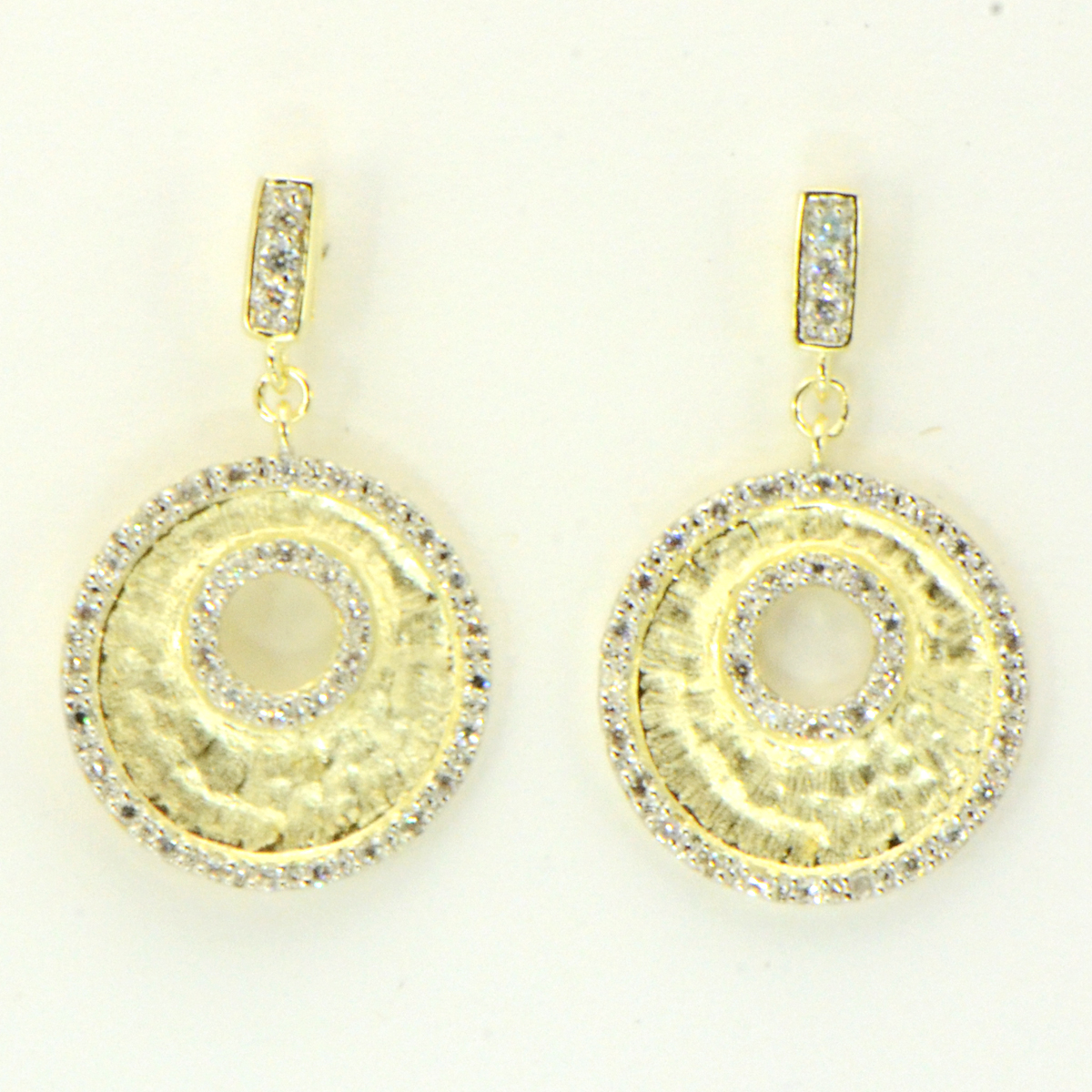 - Matte Gold Overlay Textured Circle with CZs & Pave Posts