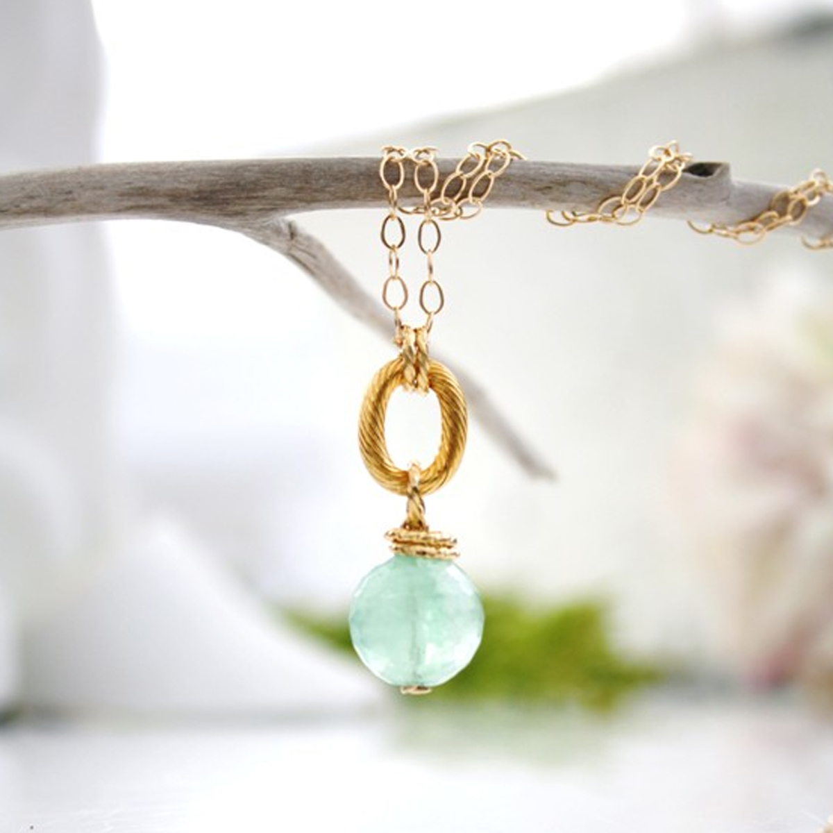 - 12mm Fluorite faceted ball, Gold plated Oval & ring Pendant on Gold filled Oval Chain