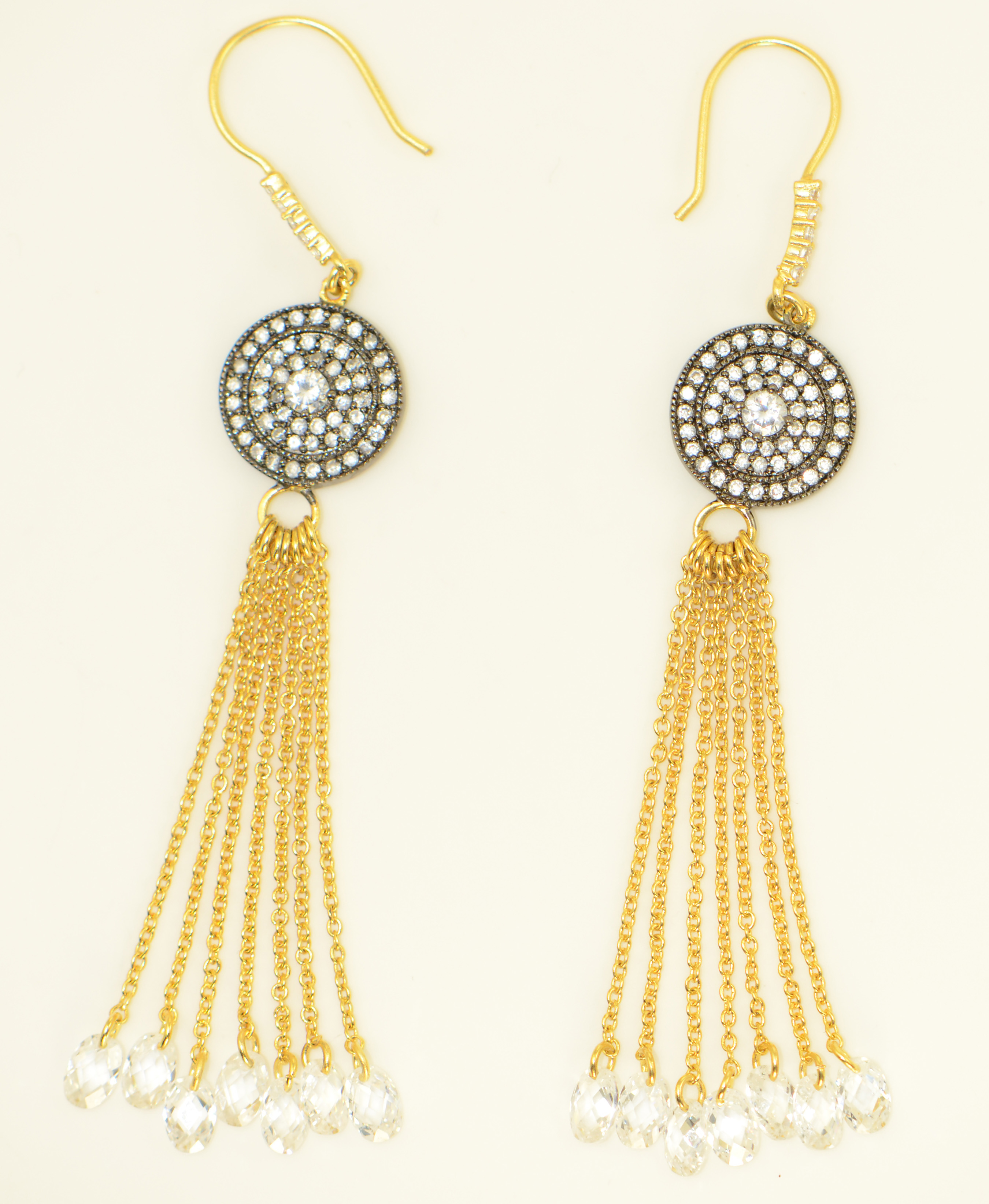 14K Vermeil Tassel earring with Pave Circular Design & Clear Drop Stones