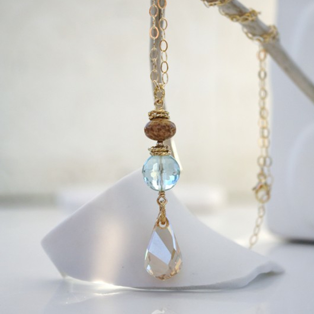 - 18mm Swarovski crystals helix, 10mm Blue Quartz ball & landscape jasper roundel pendant on gold filled cable chain.