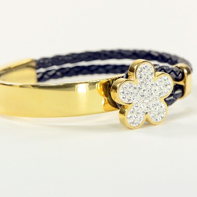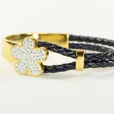 - Gold Tone Pave Flower & Black Leather Half Cuff