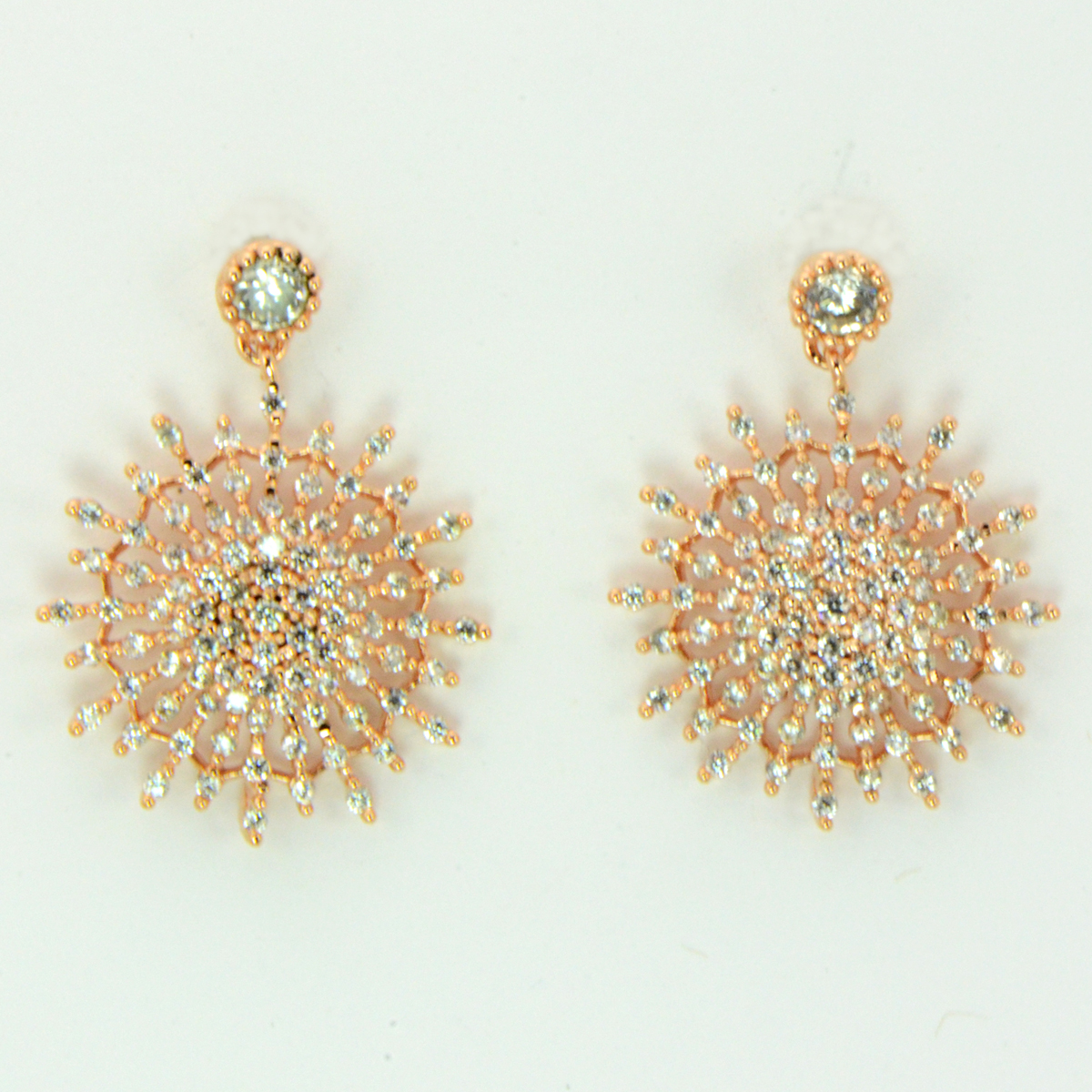 - Handset High Quality Pave CZ Sunburst Drop Earrings in Rose Gold Finish