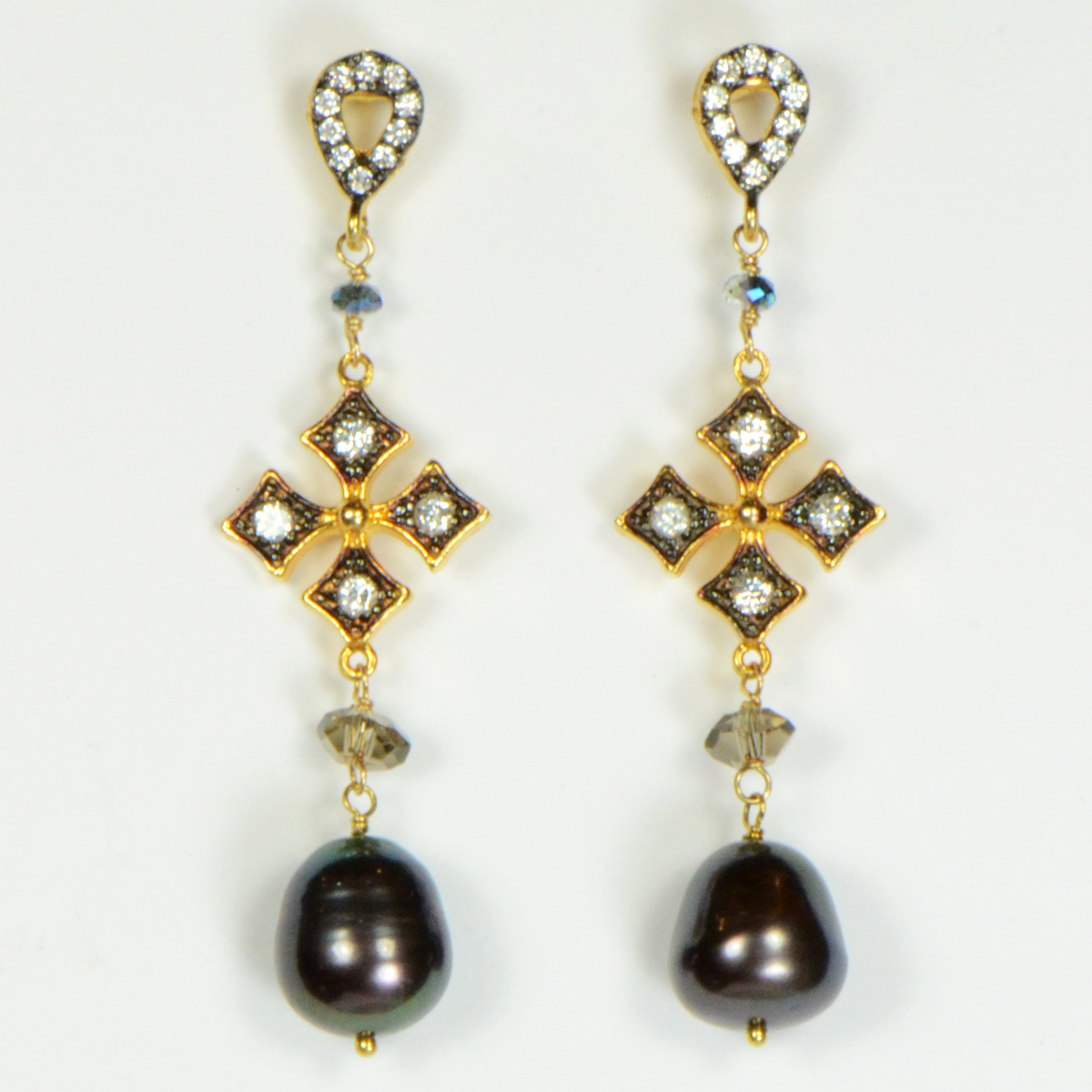 - 22kt Gold Over Sterling Silver & Rhodium Accents with CZs & Black Pearl Drop