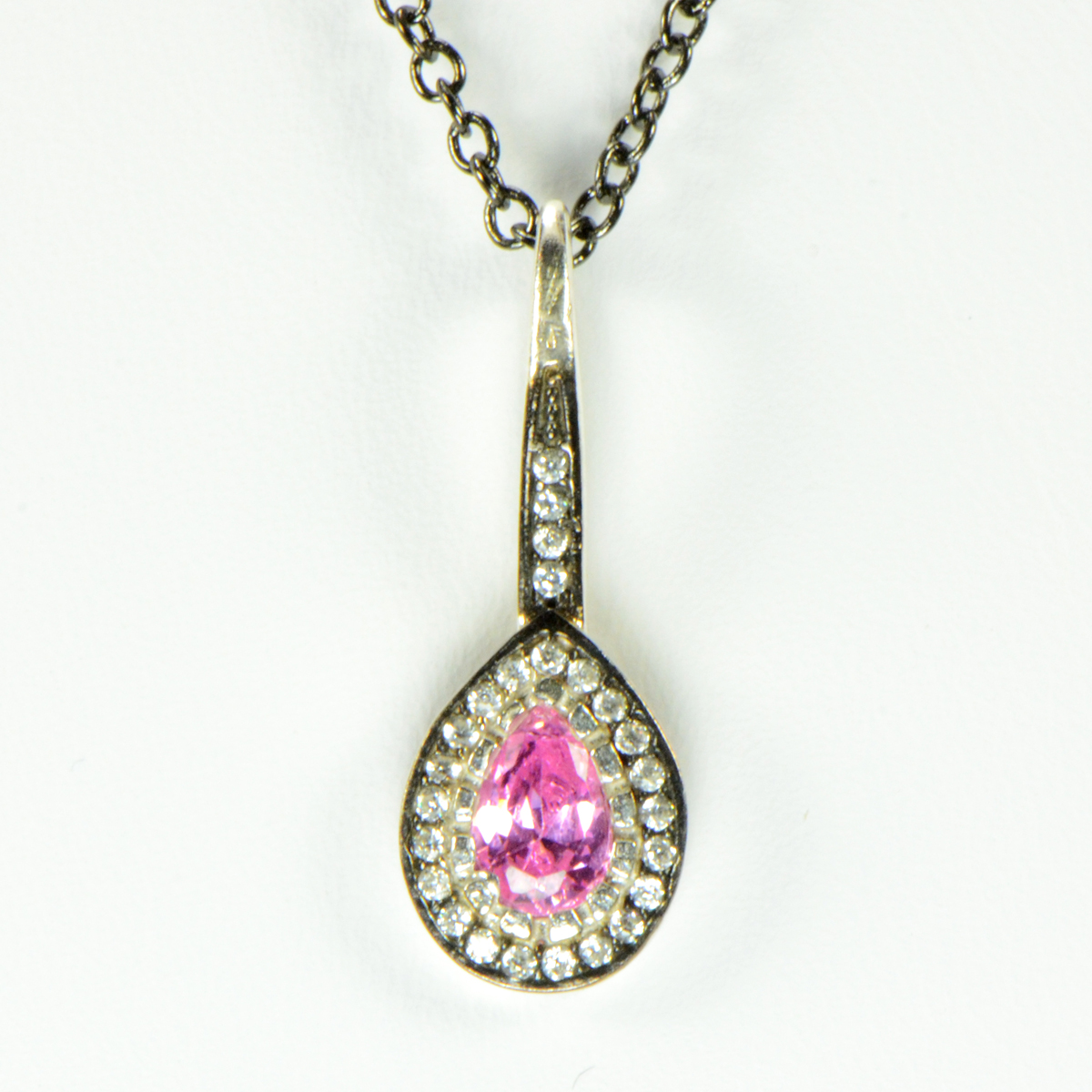 - Delicate Silver Pink CZ Teardrop Pendant with Rhodium Accents & Pave CZs