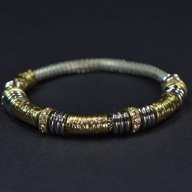 - Mixed Accents of Gold & Silver Roundelles & Cylinders on Silver Mesh