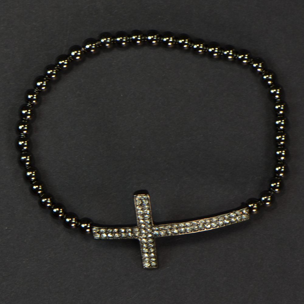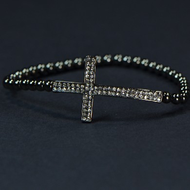 - Gunmetal Beads with 1 1/2" Crystal Cross - Stretch Style