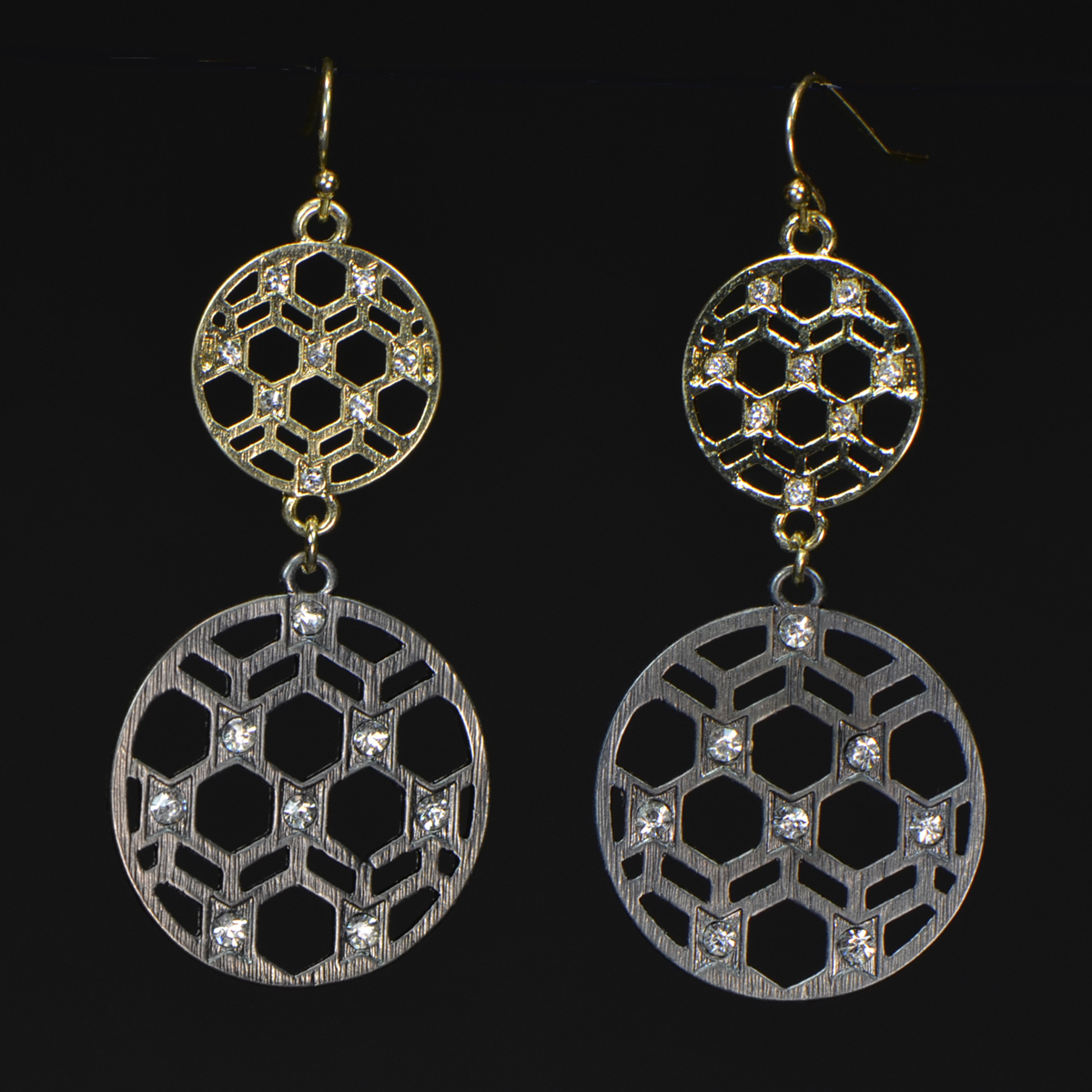 - Round Filigree Double Drop Earrings with Gold & Gunmetal Grey Colour Plating & Crystals