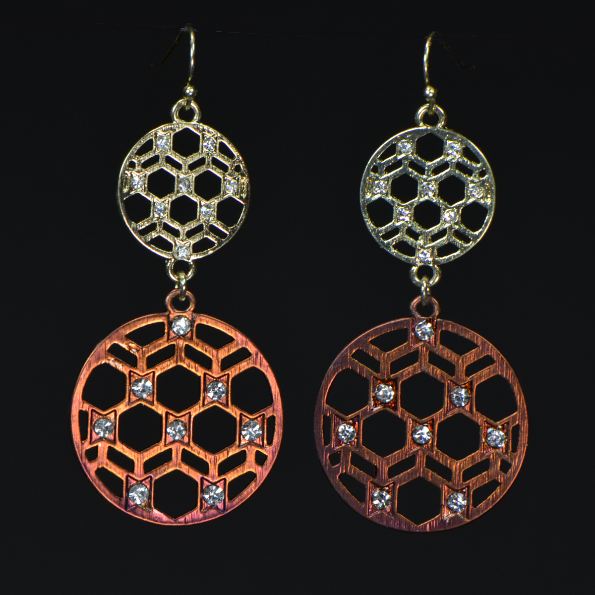 - Round Filigree Double Drop Earrings with Gold & Copper Colour Plating & Crystals