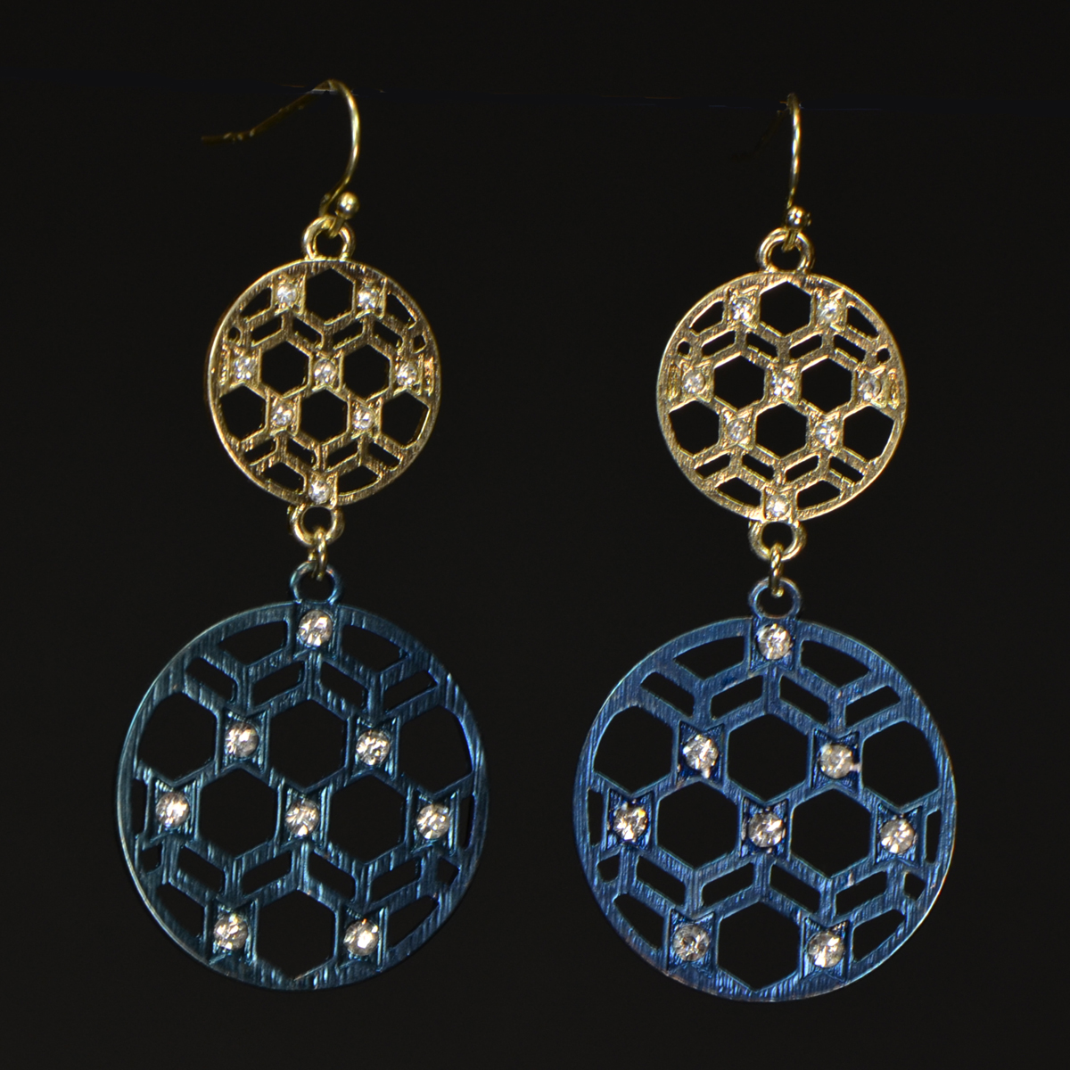 - Round Filigree Double Drop Earrings with Gold & Navy Colour Plating & Crystals