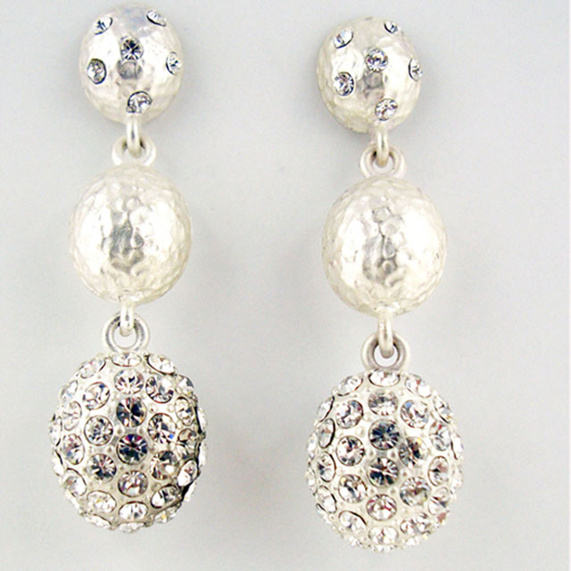 - 3 Drop Hammered Silver Metal Earrings with Crystal Pave Ball