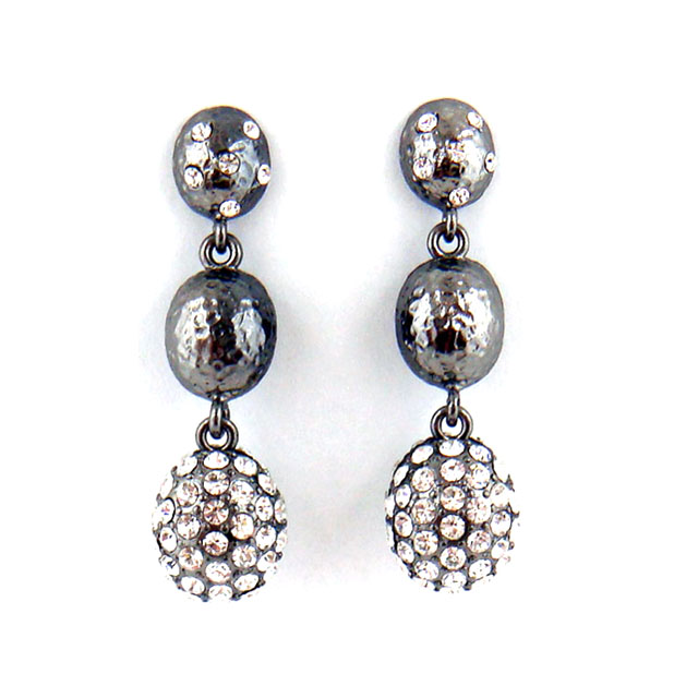3 Drop Hammered Gunmetal Black Earrings with Black Crystal Pave Ball