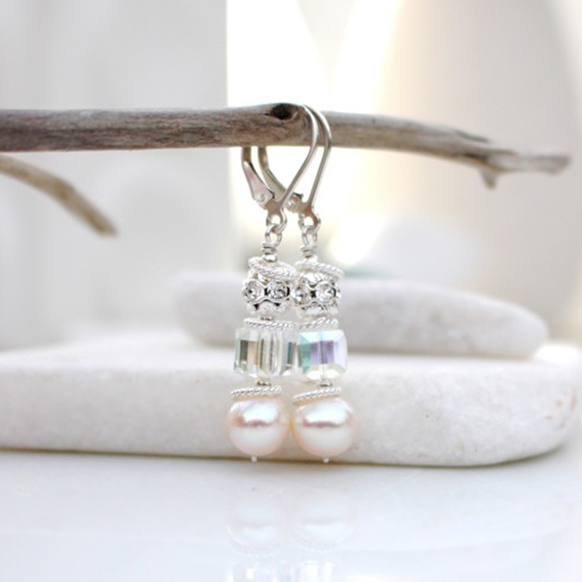 - 6mm Swarovski silver plated & crystal balls, 6mm moonlight cubes, white freshwater pearls & silver twist rings.